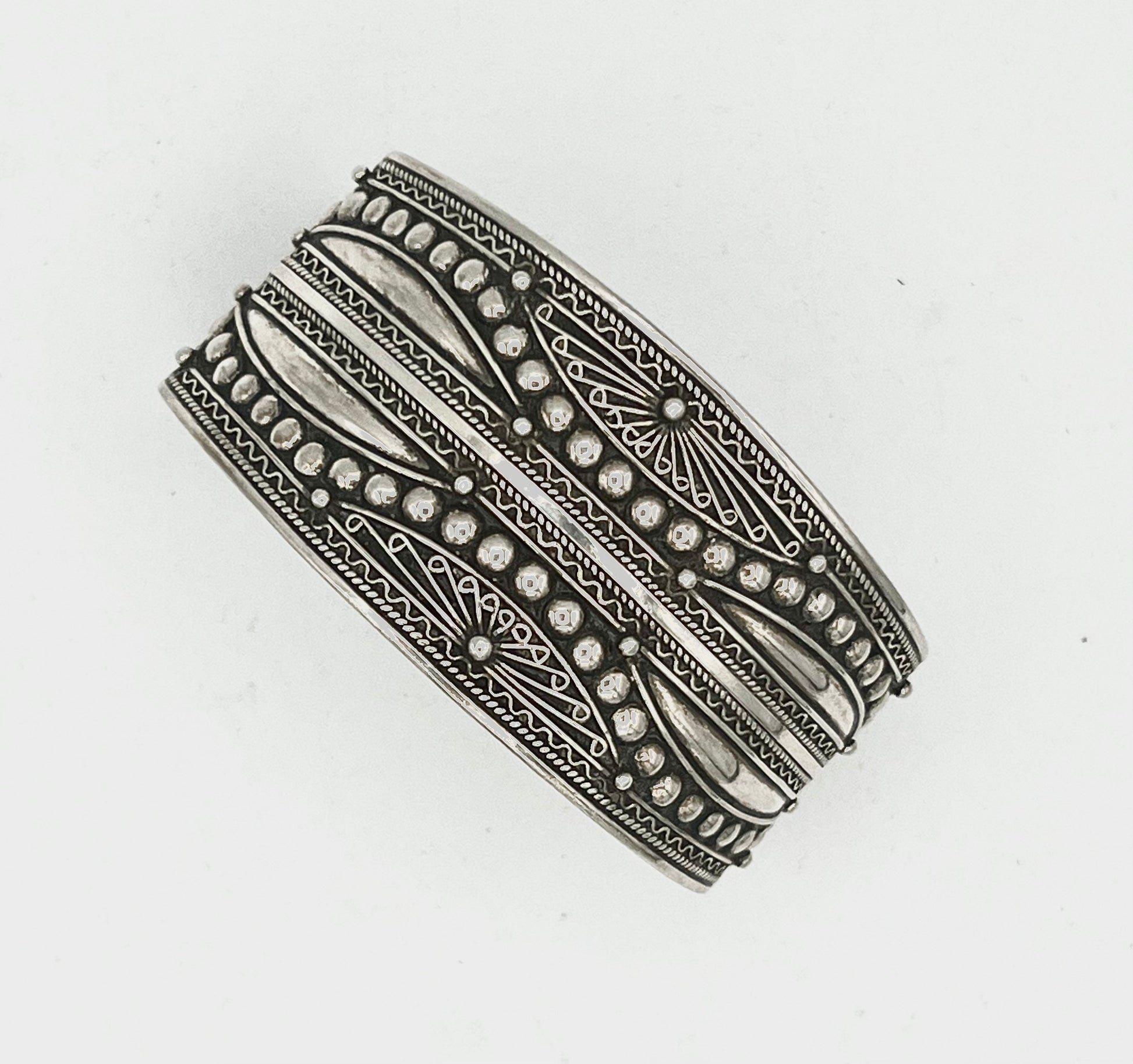 An one-of-a-kind bracelet that will immediately upgrade your look. Handmade using Jewish-Berber techniques and made of sterling silver. Material: Sterling Silver. Measurements: 1.4" width. No closure. Slight flex.