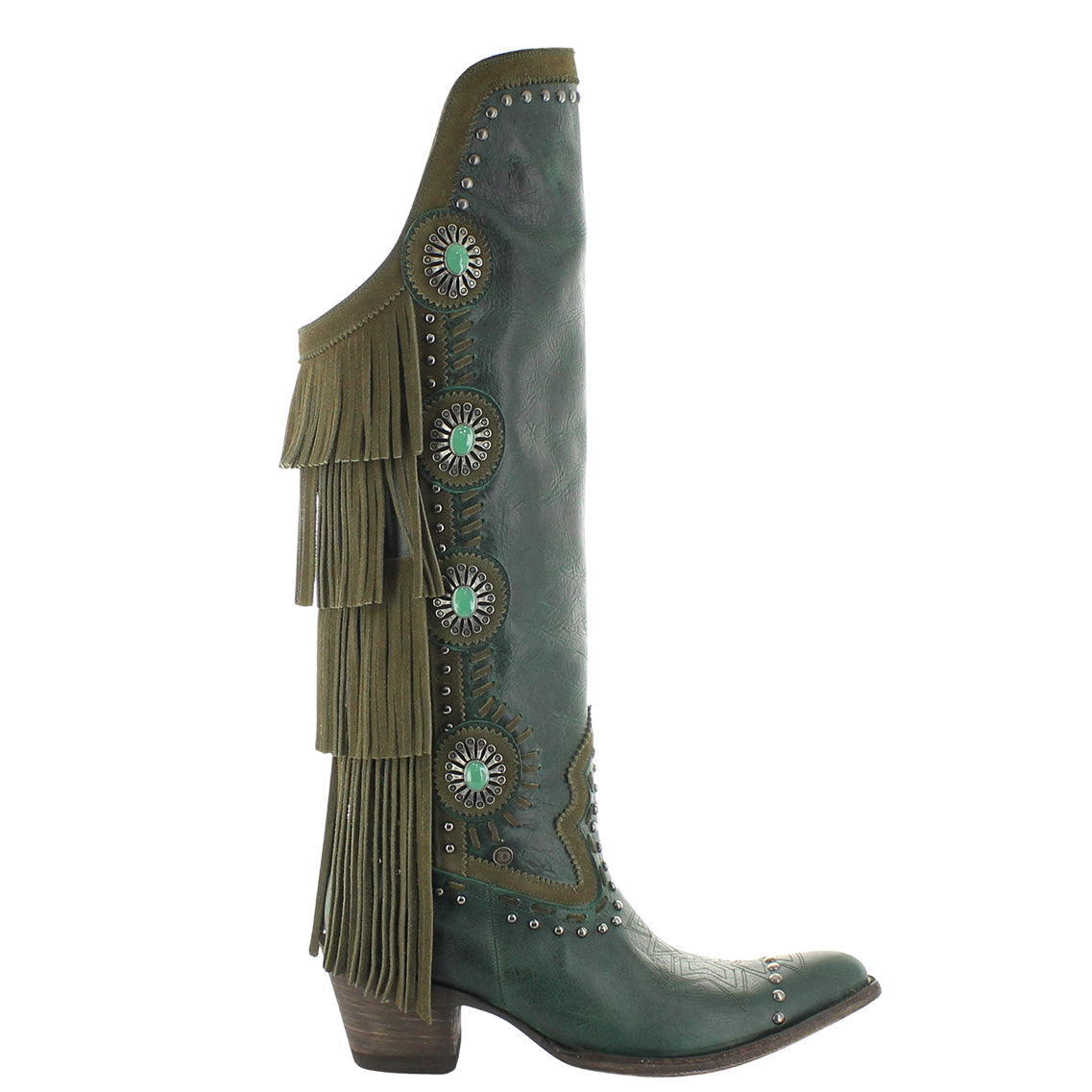 Meet the 19-inch Bernalillo boots—a nod to the women of the West who did things their own way. With rich olive tones, silver conchos, and subtle turquoise accents, these boots carry the spirit of vintage frontier style with quiet confidence. Refined yet rugged, they're made for the woman who rides with grace and grit.