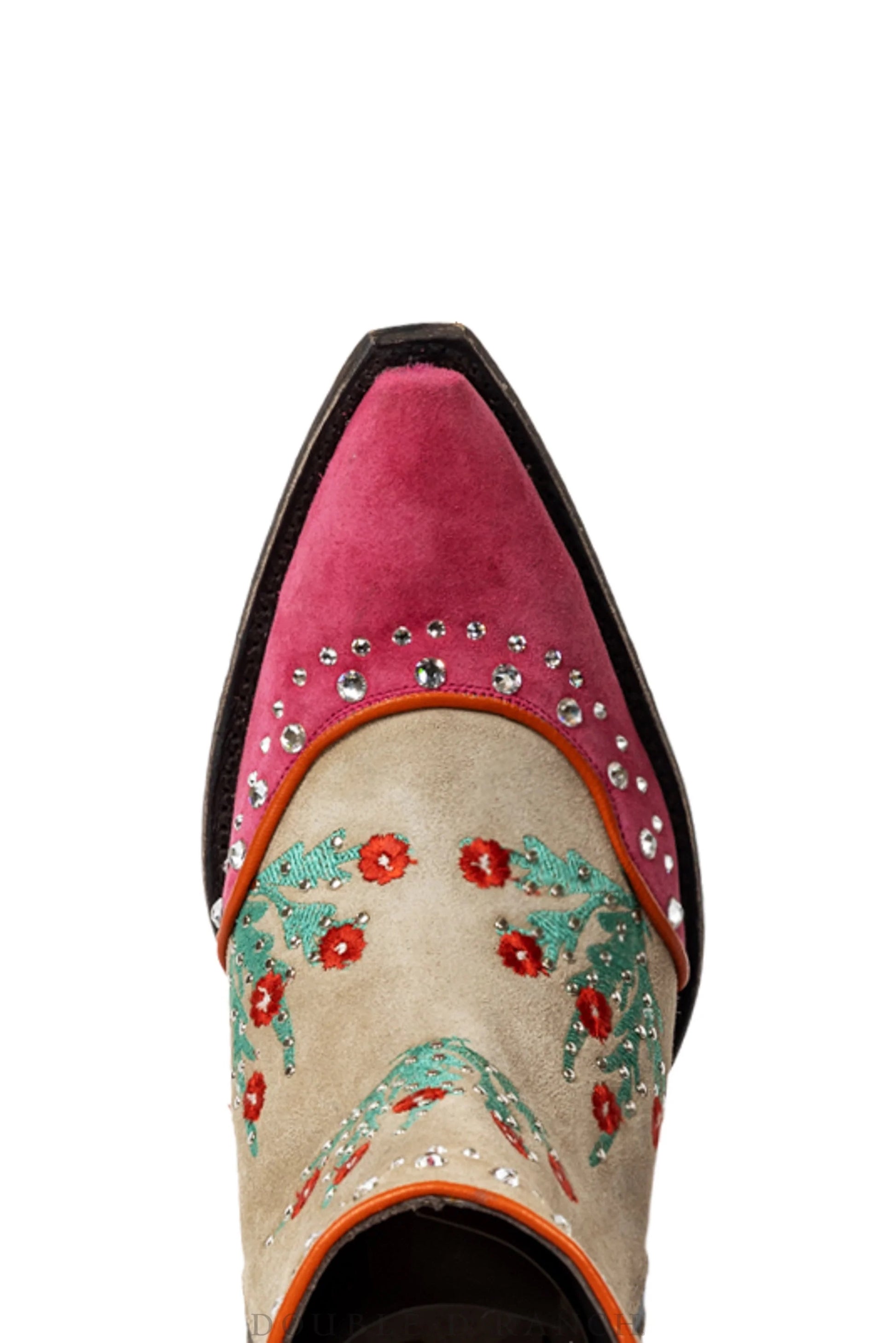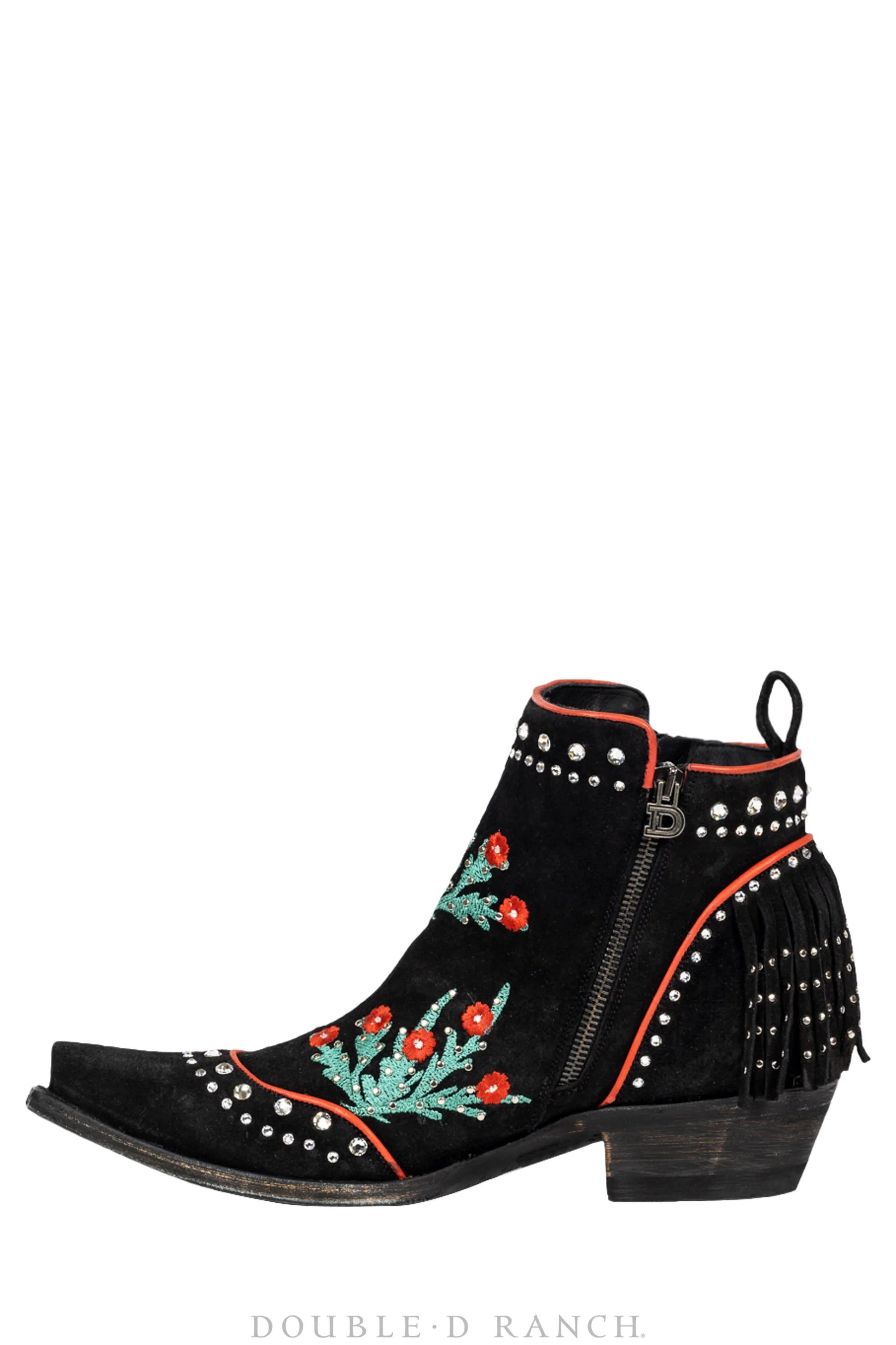These bold, blingy boots are a chic suede side-zip silhouette featuring colorful cactus embroidery and contrasting leather trim, embellished with rhinestone accents, and finished with sparkle-studded fringe. Talk about the ol’ razzle dazzle!
