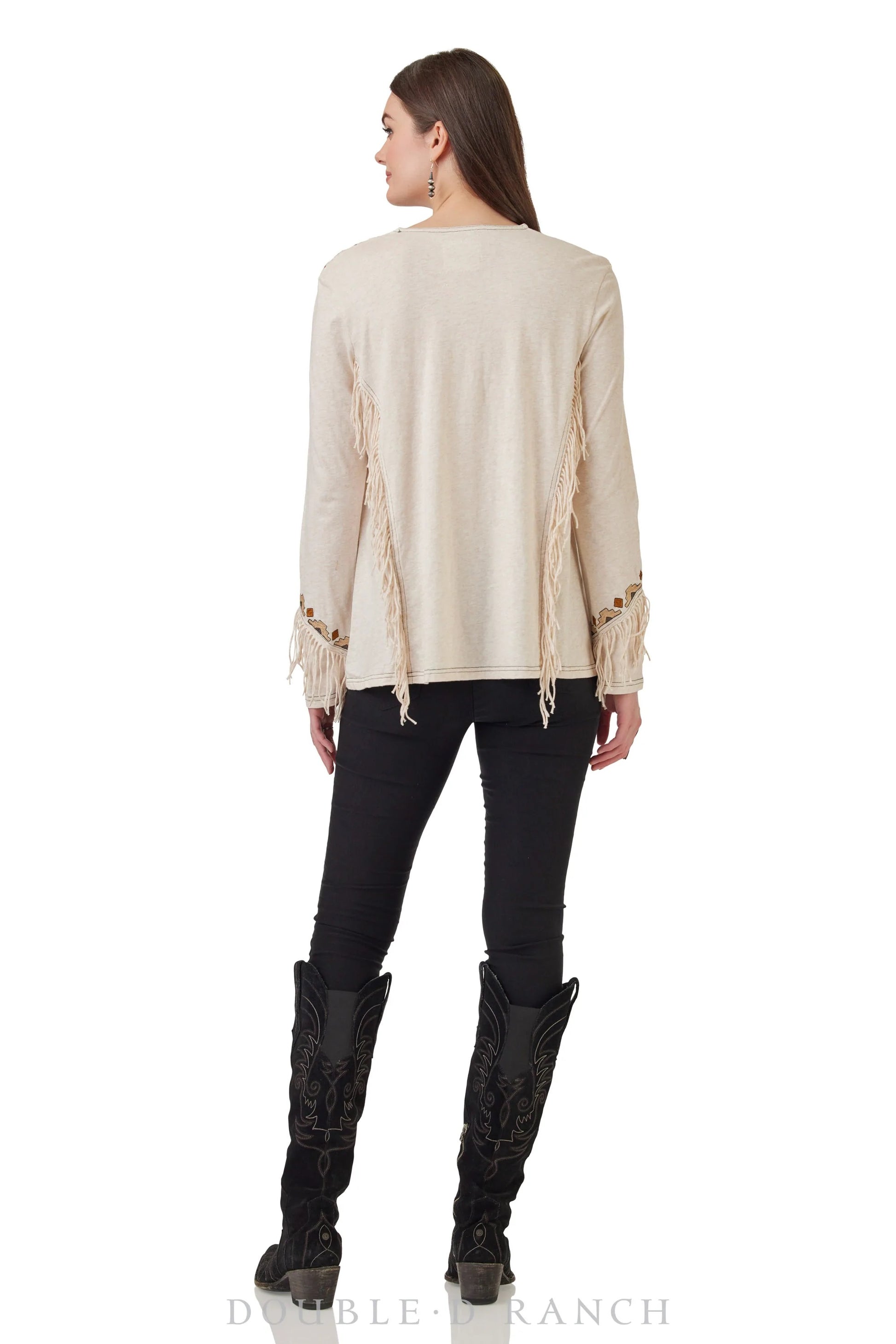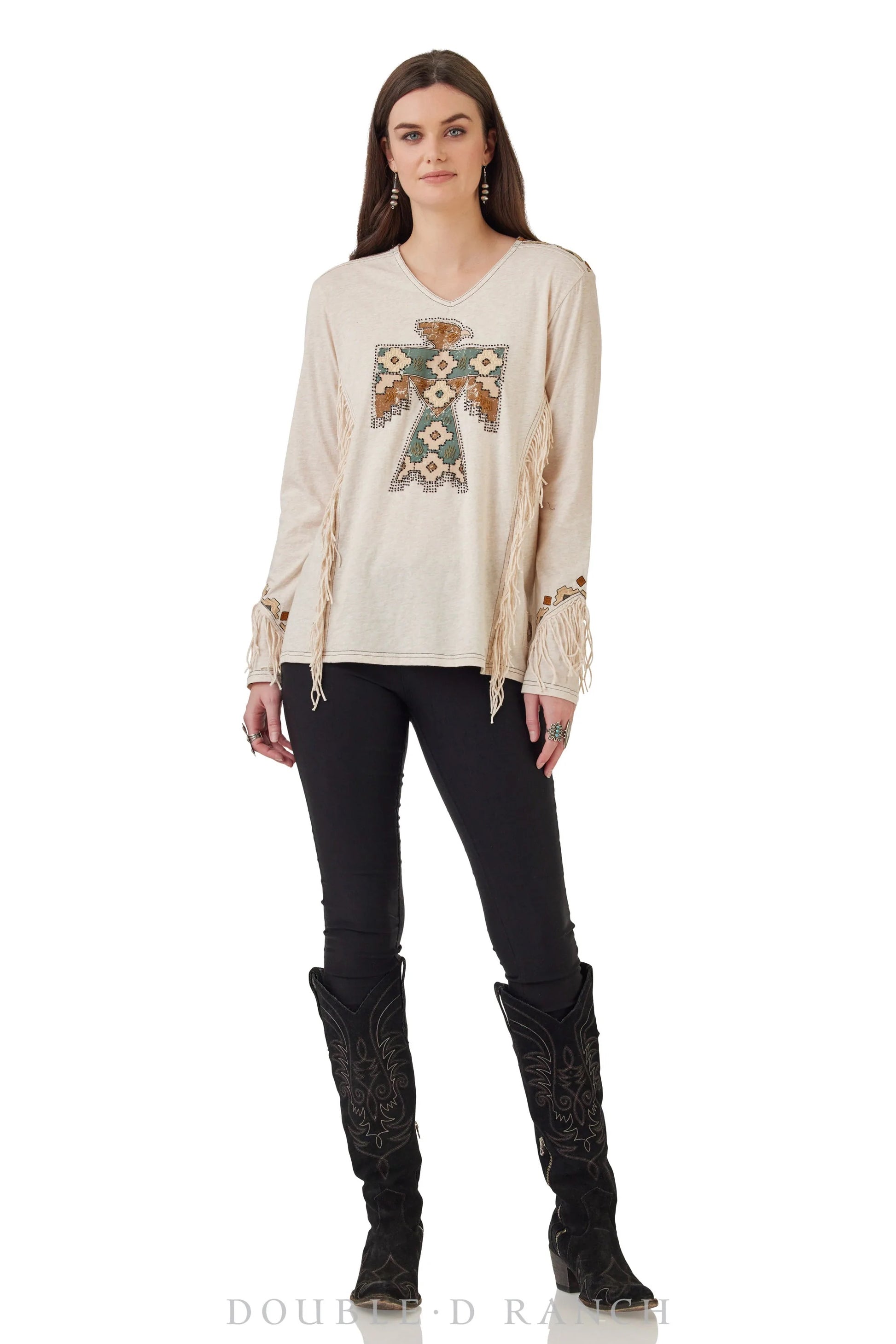 Turn heads and steal hearts in this cool cotton top. The casual long-sleeve top is emblazoned with a bold thunderbird, embellished with embroidery and beadwork, and finished off with fabulous elements of fringe for some eye-catching movement that’s impossible to ignore. Hope you like compliments!