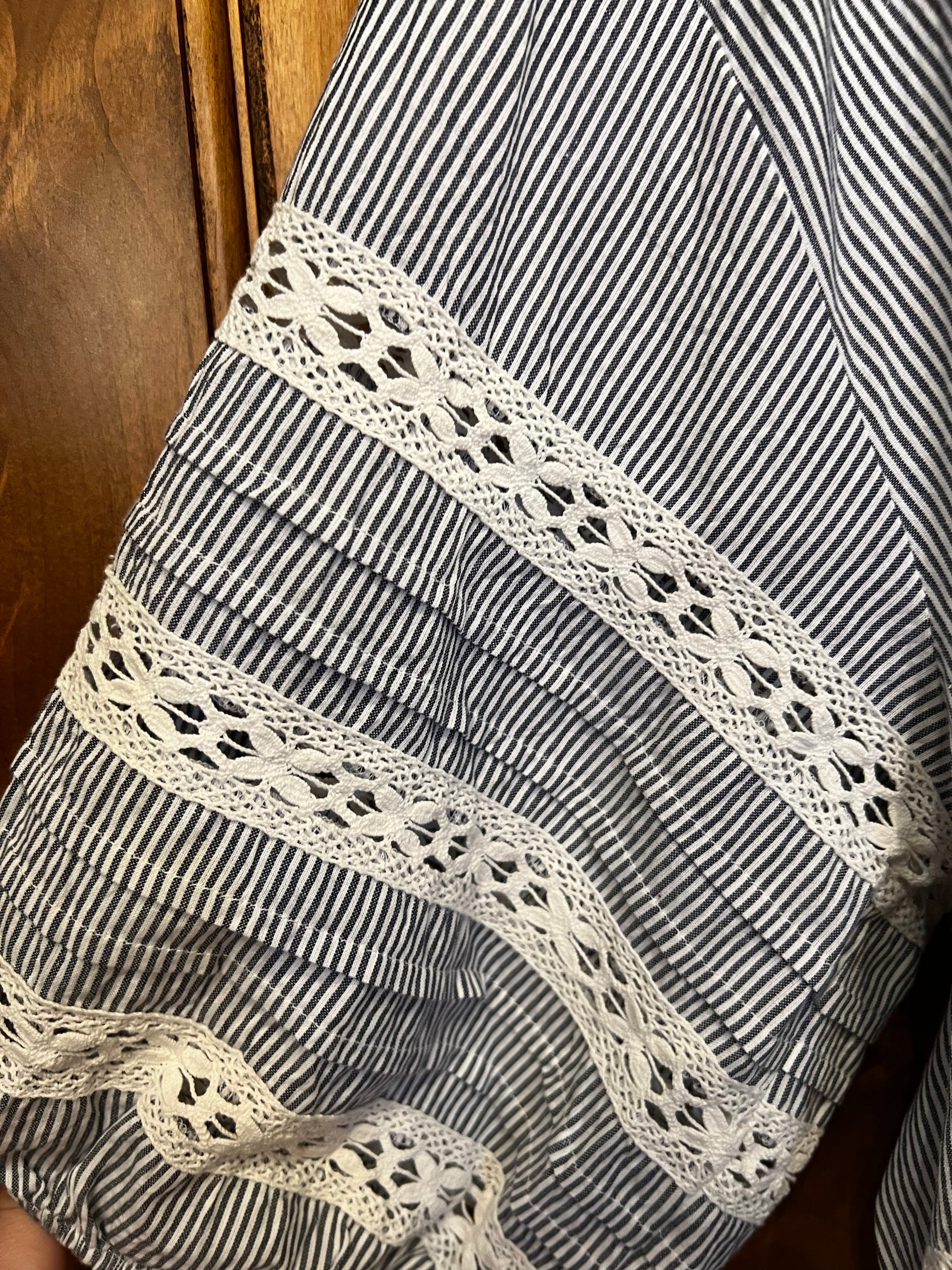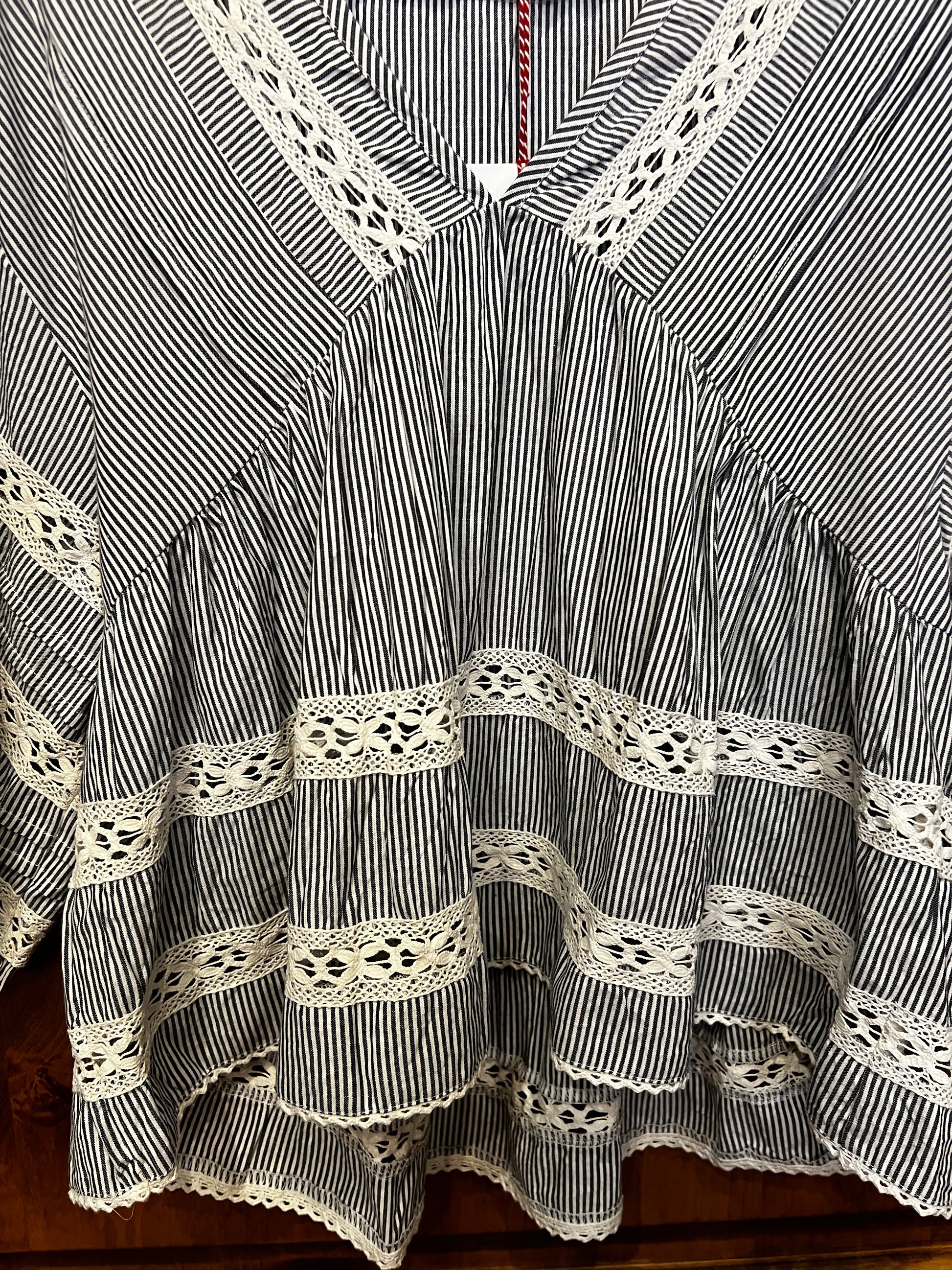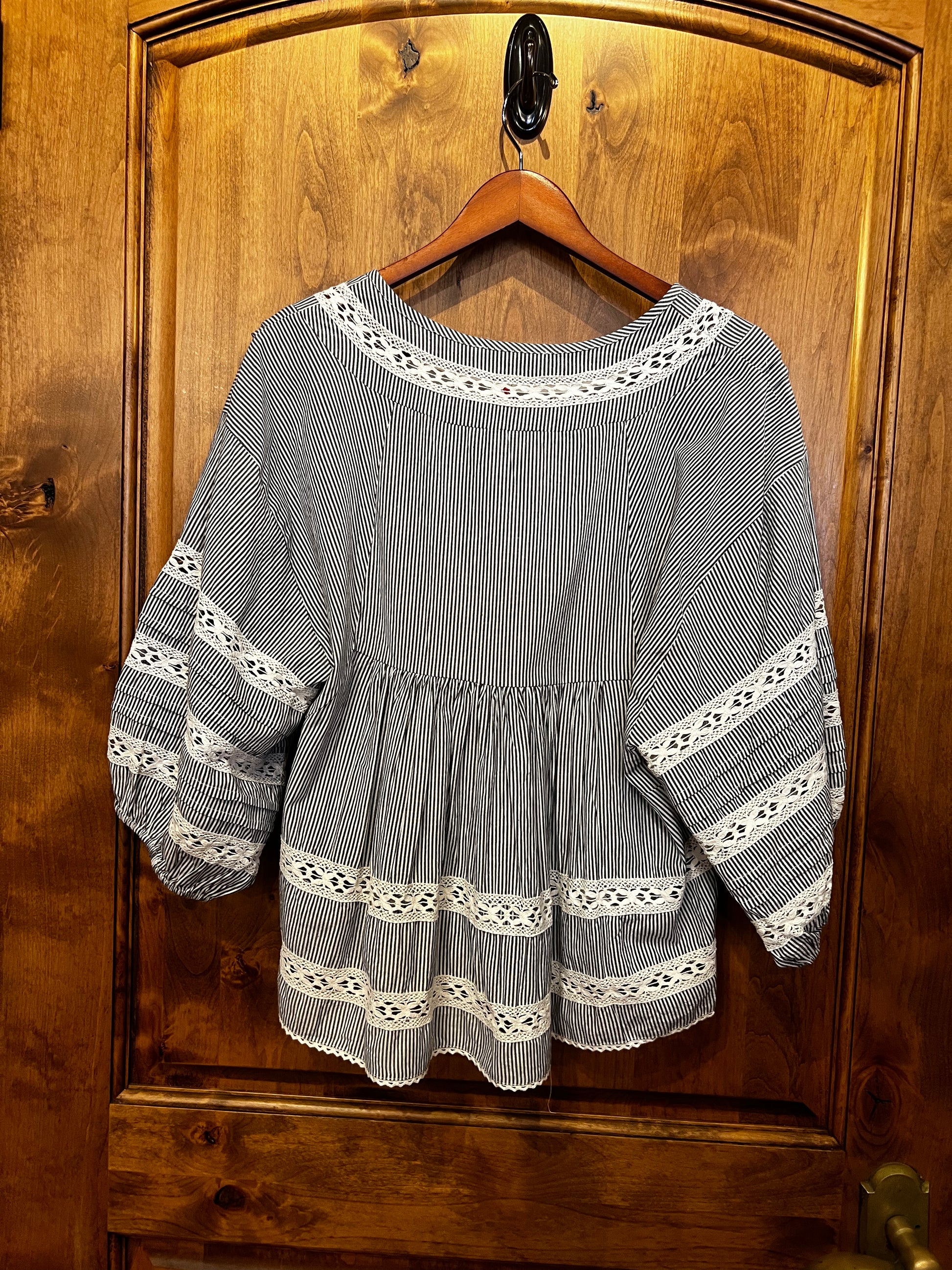 Perfect for those spring and summer get togethers! Light and flirty! Pairs with jeans, white pants, skirts and more! Blue and white stripe.