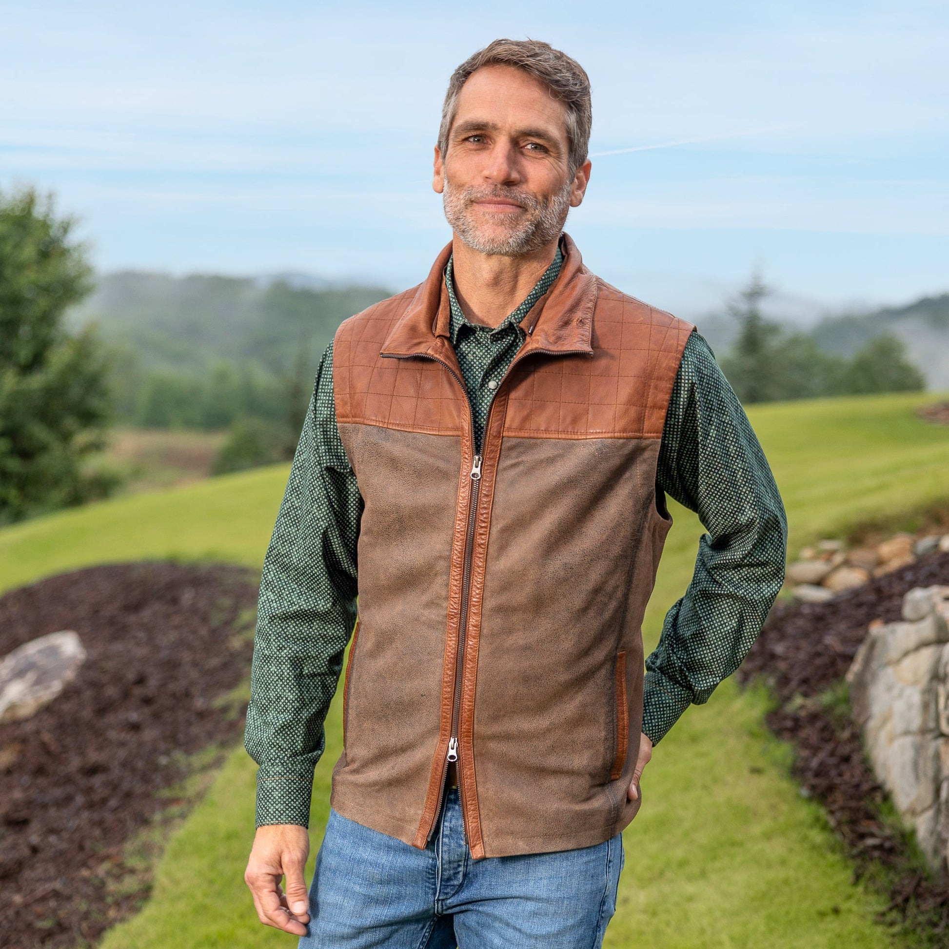 Removable Shearling Collar Zip Front Vest with Contrast Trims 2 Lower Seam Pockets with Contrast Trim Box Quilted Yoke Madison Creek Outfitters Signature Hombre Acetate Lining