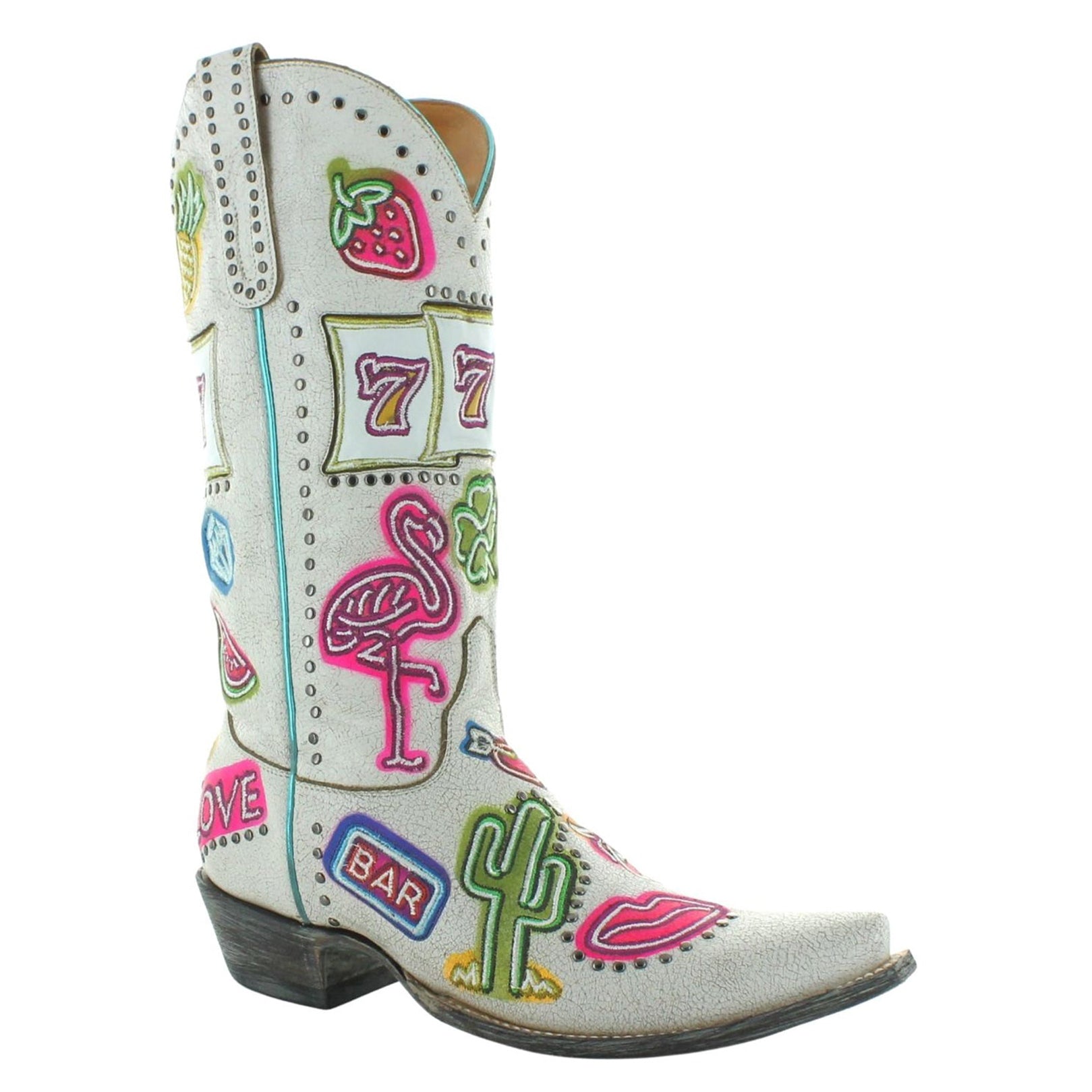 Make every step a winning step and hit the jackpot with these fun and elevated pair of cowgirl booties. Fun colored embroidery and patchwork with stud accents. A classic western silhouette with side pull tabs, snip toe and leather stacked heel. The black leather provides the perfect backdrop for all the pop of colors.