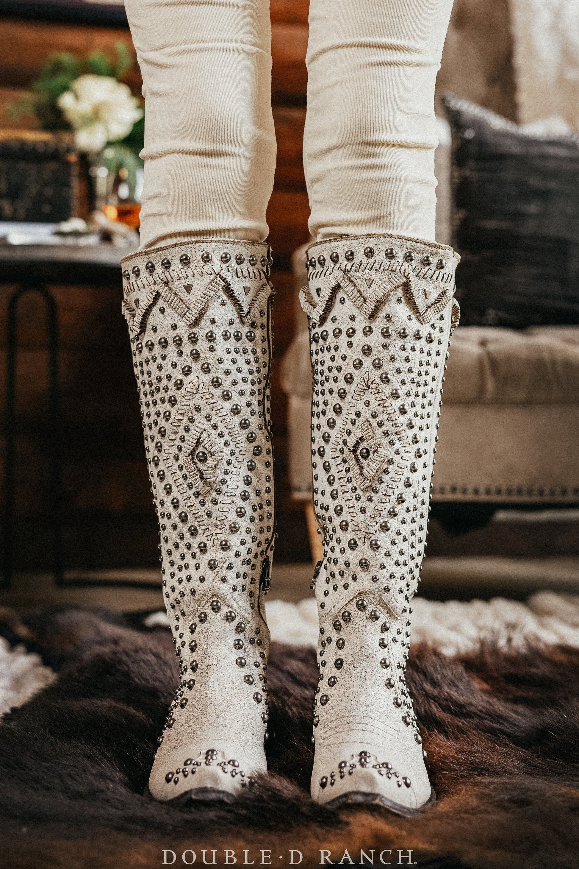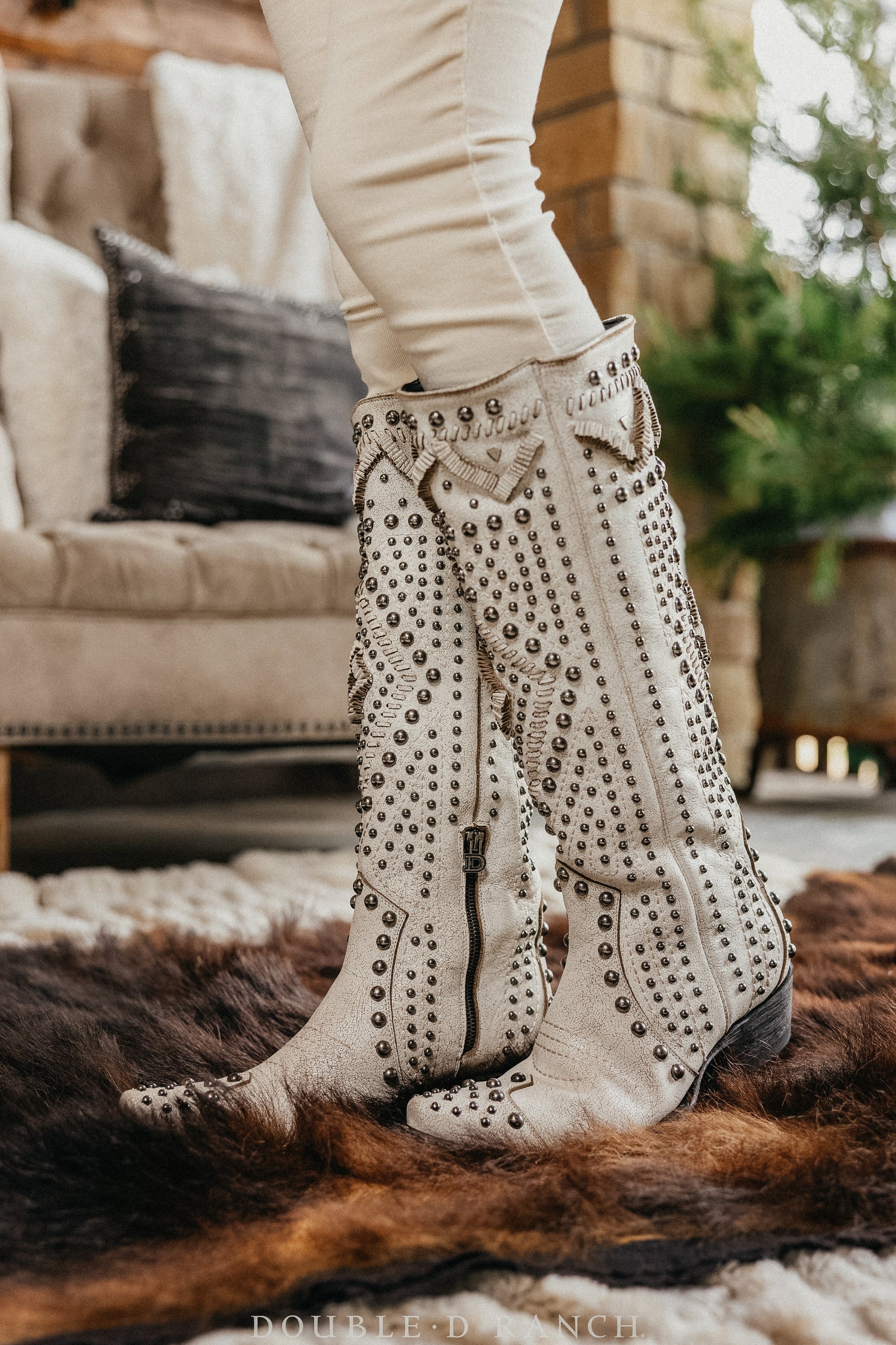 This season’s statement boot takes studding to a whole new level. The Legend Keeper Boot has a tall, straight-top silhouette with a shaft that’s heavily embellished with metal studs and dimensional leather lacing details. The warm winter white hue makes these beauties a year-round neutral that you can rock from the holidays to the honkytonk!