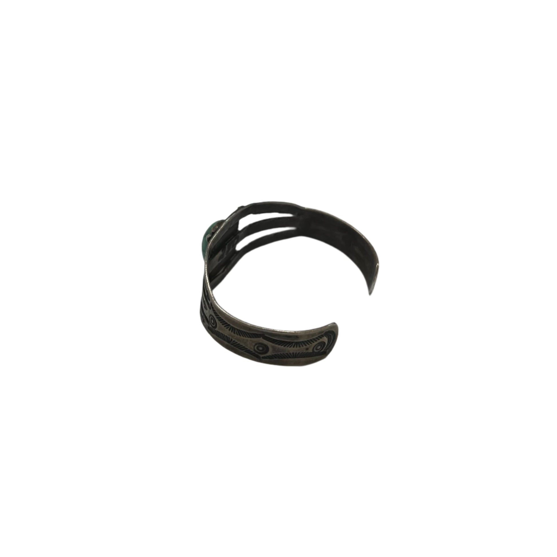Oval turquoise, sterling silver cuff with stamped art work. Can be bent opened or closed to fit wrist.