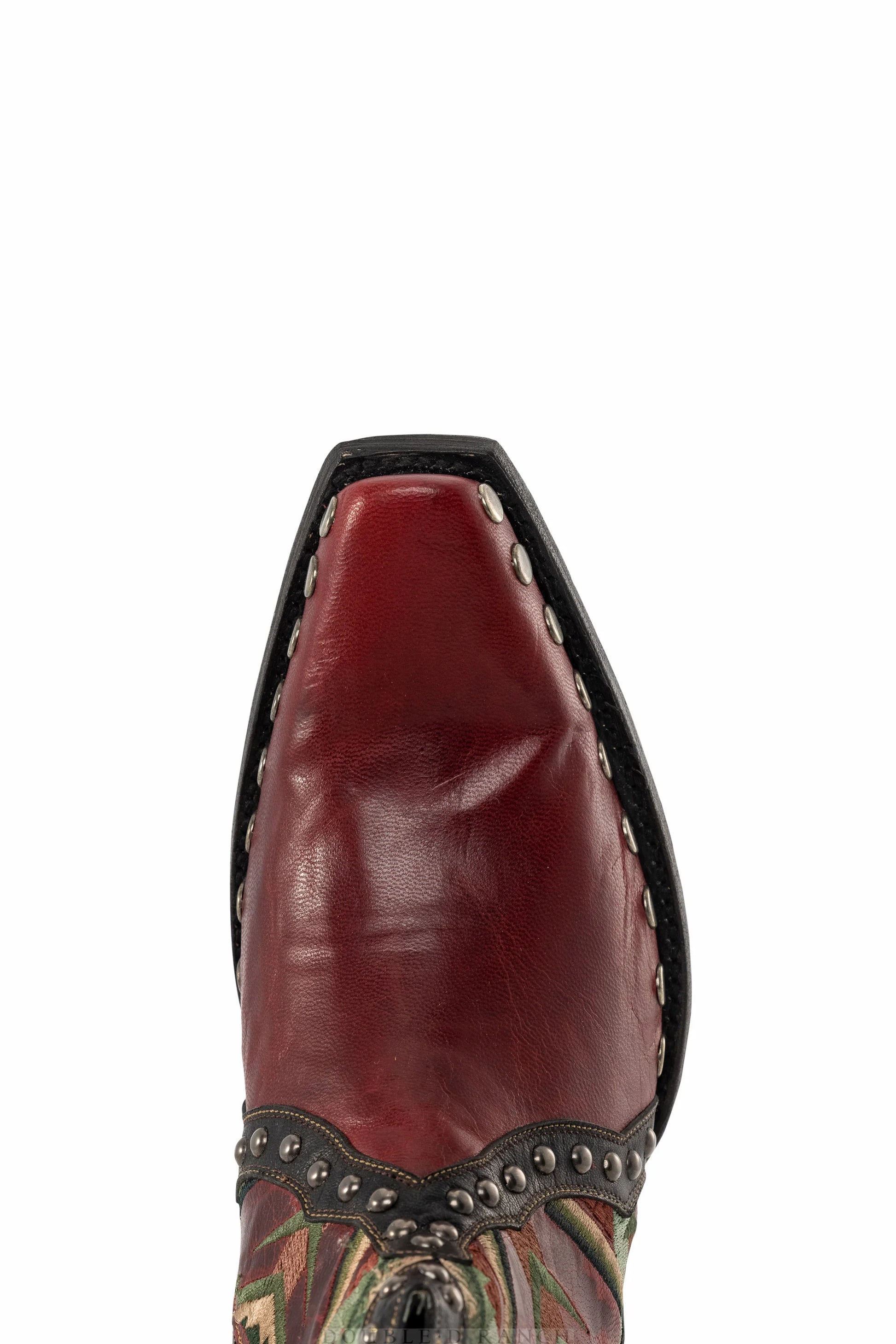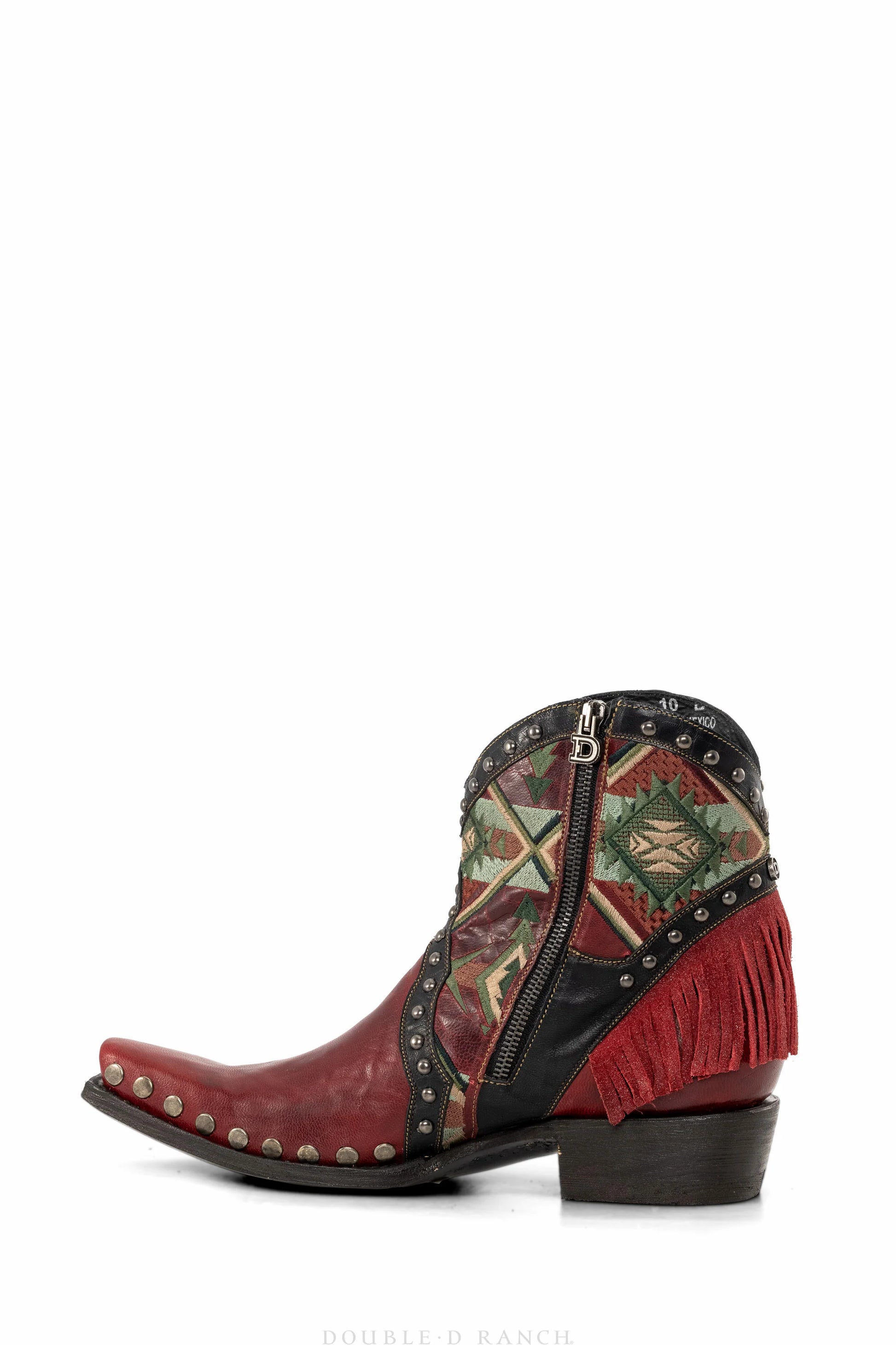 Designed as part of the Fall 2021 Heritage Departures collection, these little shortie boots really channel that cabin-mountain-western vibe that carries throughout. The eye-catcher is the shaft of the boot, embellished with colorful embroidery in geometric patterns reminiscent of camp blanket patterns. Or it might be the fabulous suede fringe that adorns the heel box – hard to say, both are pretty fabulous and impossible to ignore! The boots are anchored by the chic simplicity of the leather toe box and complementing leather trim, and finished with classic studding. Gorgeous, must-have booties from top to toe!