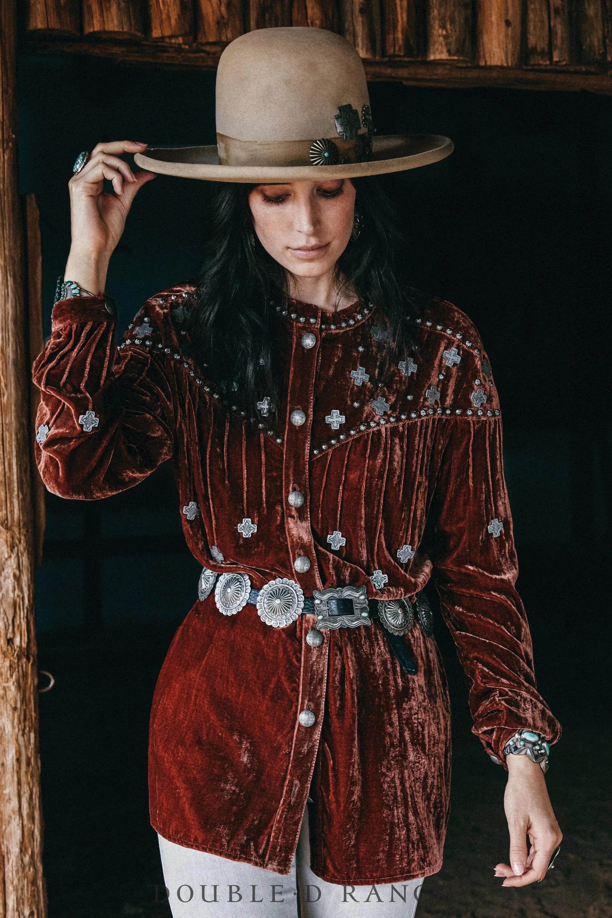 This top is the epitome of effortless elegance. The chic silhouette is flowy, forgiving, and universally flattering (it also looks great belted if you want a little more structure) and the luxe velvet already looks and feels like a million bucks. Add some studding, some pintucks, some custom crosses and conchos, and girl – you are a VISION! (And it feels as good as it looks!)