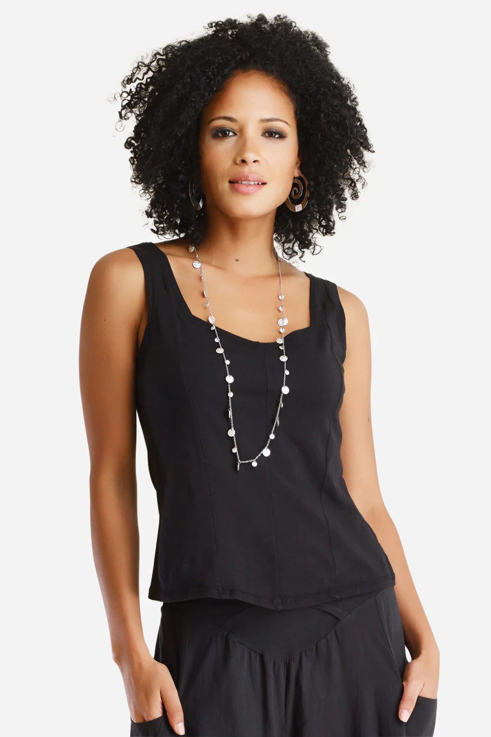 Layer our tank with stylized sweetheart neckline under a jacket or blazer for added interest. This body skimming tank with subtle curved hemline and 5 needle topstitching easily holds its own as well with jeans, shorts and skirts.
